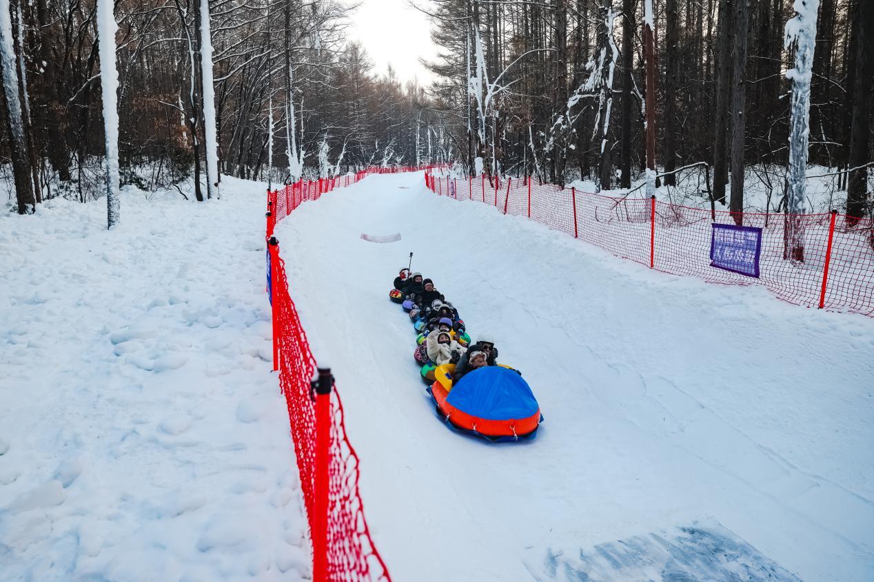 (游客畅玩净月潭景区内的森林穿越雪漂流)